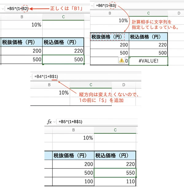 B$1とB列の1行目である消費税率の行を絶対参照しているのは正しいのですが、B$4は商品Xの税抜価格の行を絶対参照しているので、C5とC6に複写しても、計算結果は220となってしまいます。