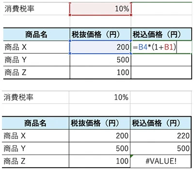 商品Yについては税率が反映されておらず、商品Zについては「#VALUE!」のエラーが表示されています。